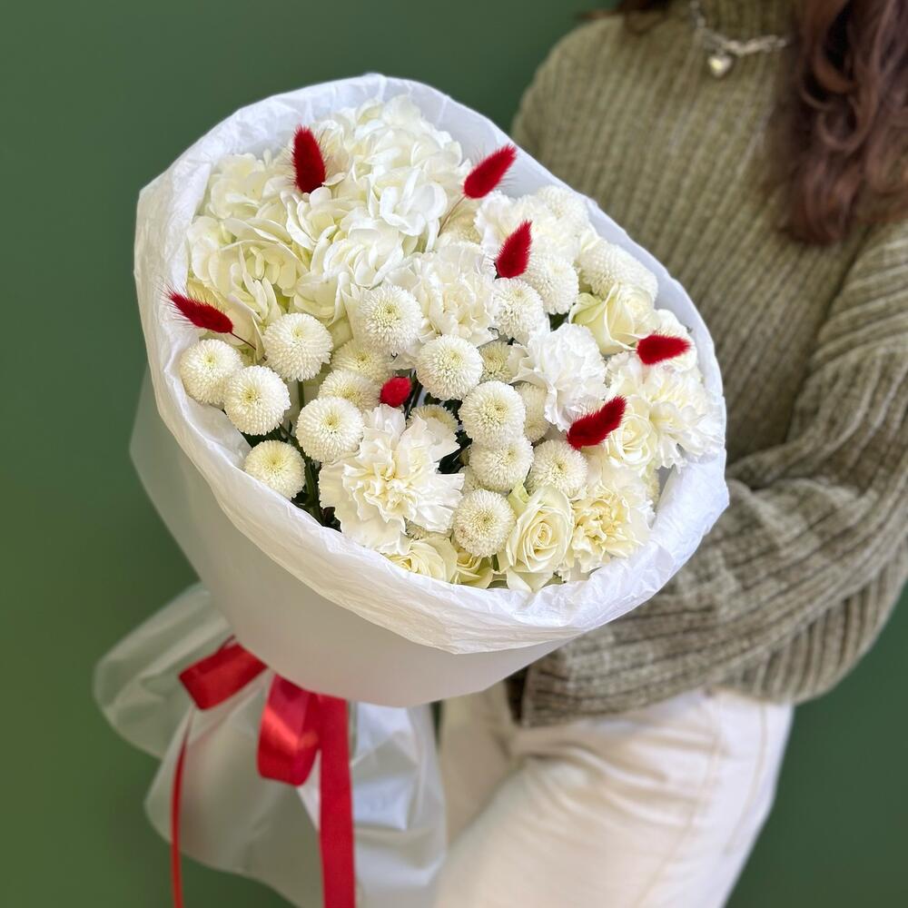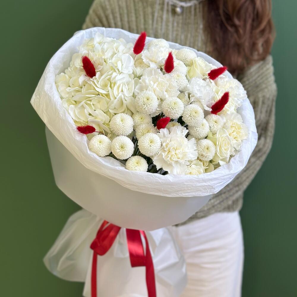 Хризантема кустовая - 4 шт. Роза белая - 3 шт. Гортензия белая - 1 шт. Оформление - 1 шт. Лагурус (сухоцвет) - 7 шт. диантус гвоздика - 6 шт.
